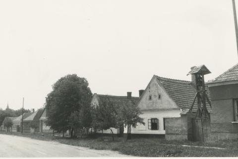 A Rákóczi utca 160. előtt álló fából készült harangláb és környezete