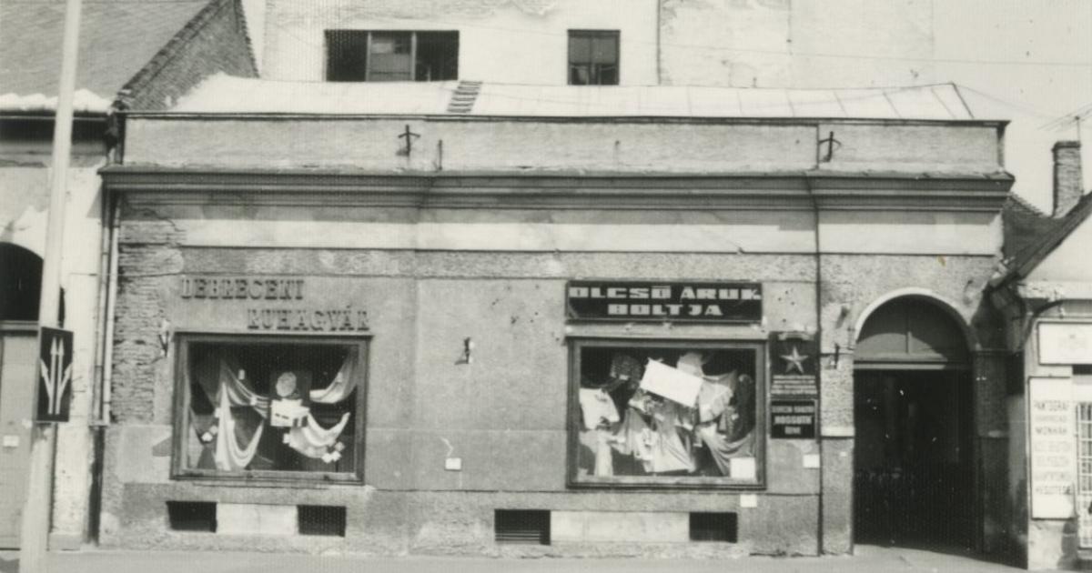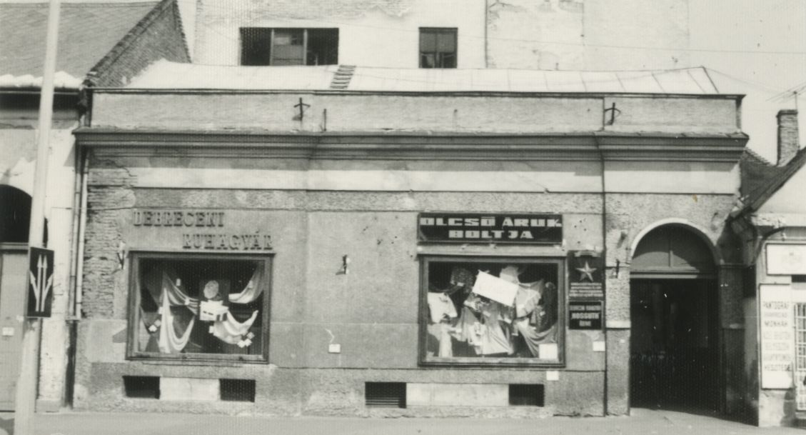 Debrecen. Csapó utca. A Debreceni Ruhagyár "Olcsó áruk boltja"