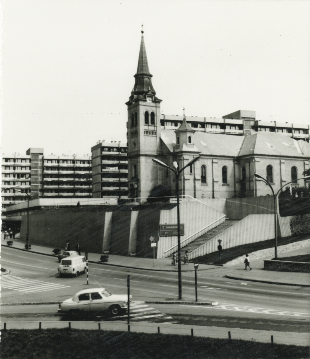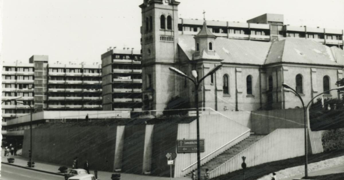Salgótarján. Rákóczi út. A katolikus templom támfala