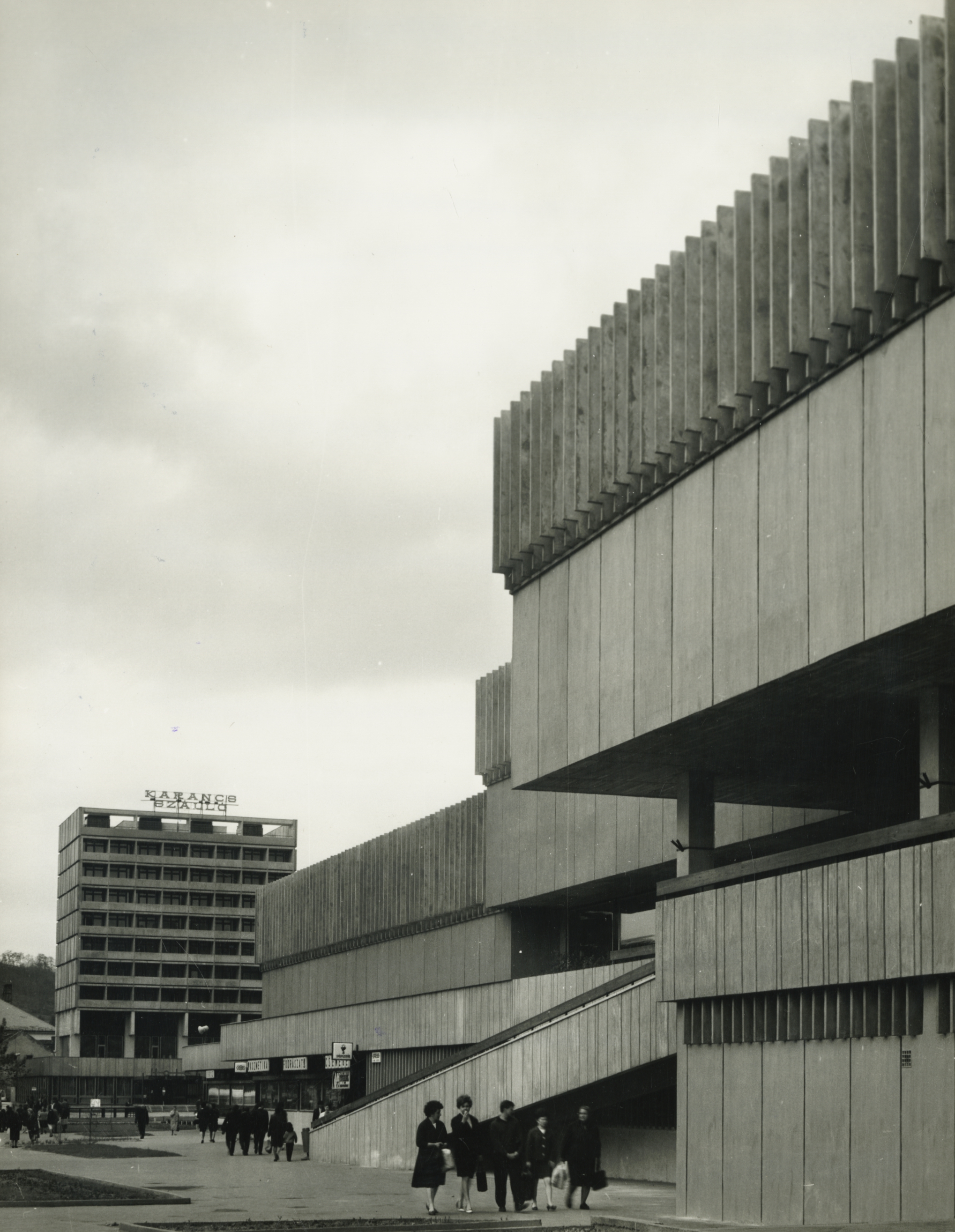 Salgótarján. Pécskő üzletház, háttérben a Karancs Szálló